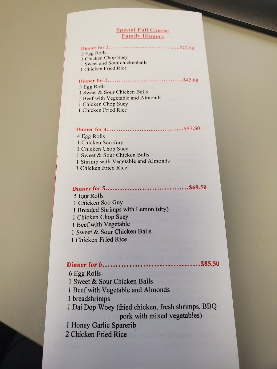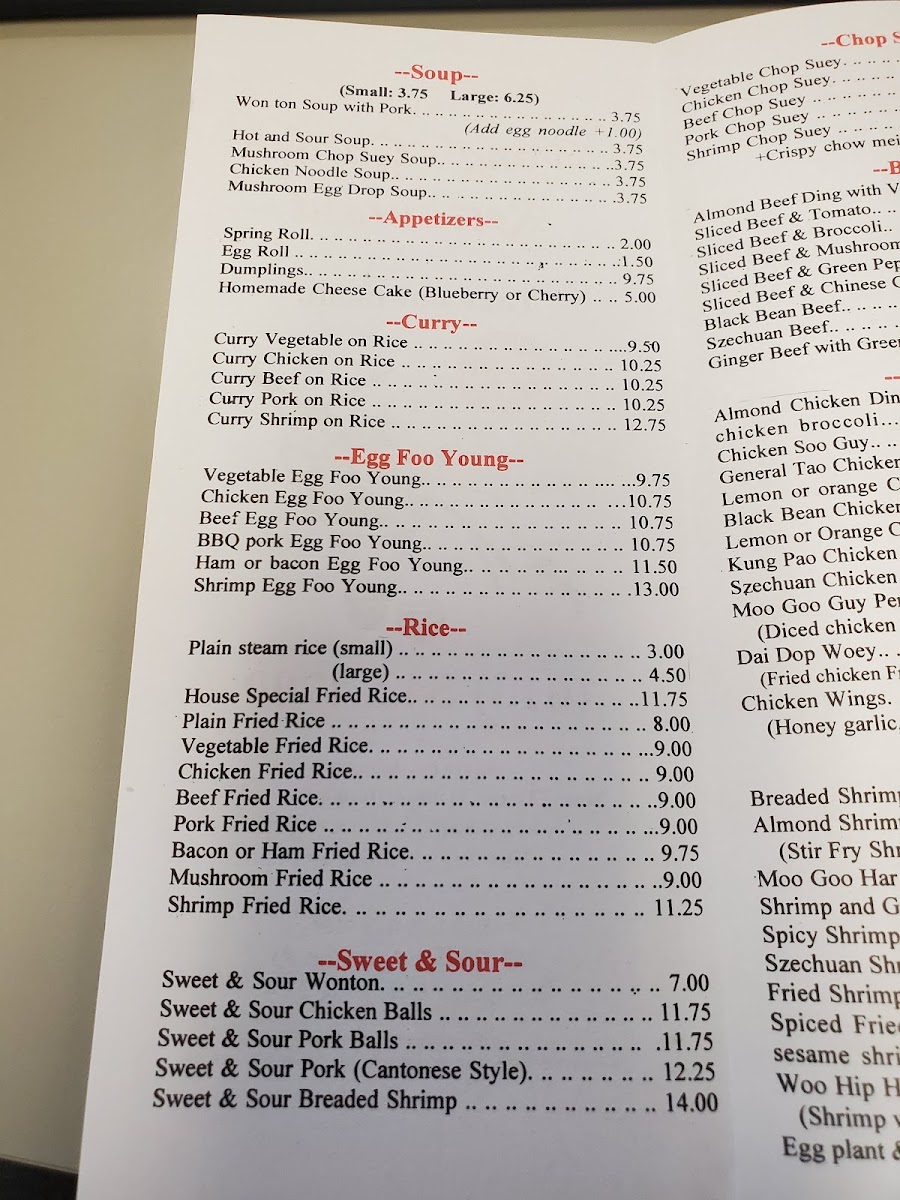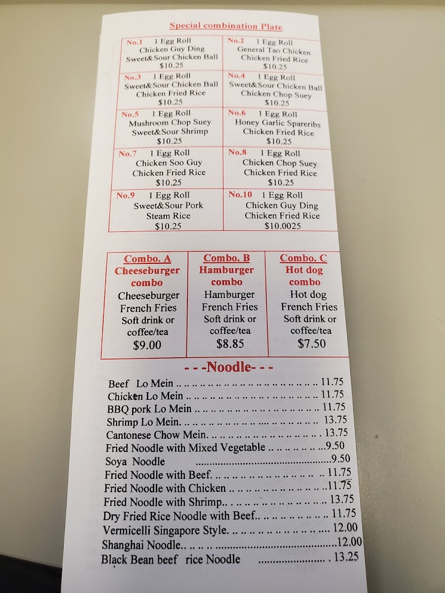 From savory lo mein and chow mein to flavorful chicken dishes including General Tao and Kung Pao chicken, the menu balances comforting staples with options to suit those who enjoy a bit of spice or variety. The selection of fried rice—from vegetable to shrimp or pork—adds a satisfying, well-rounded side or base to any meal.